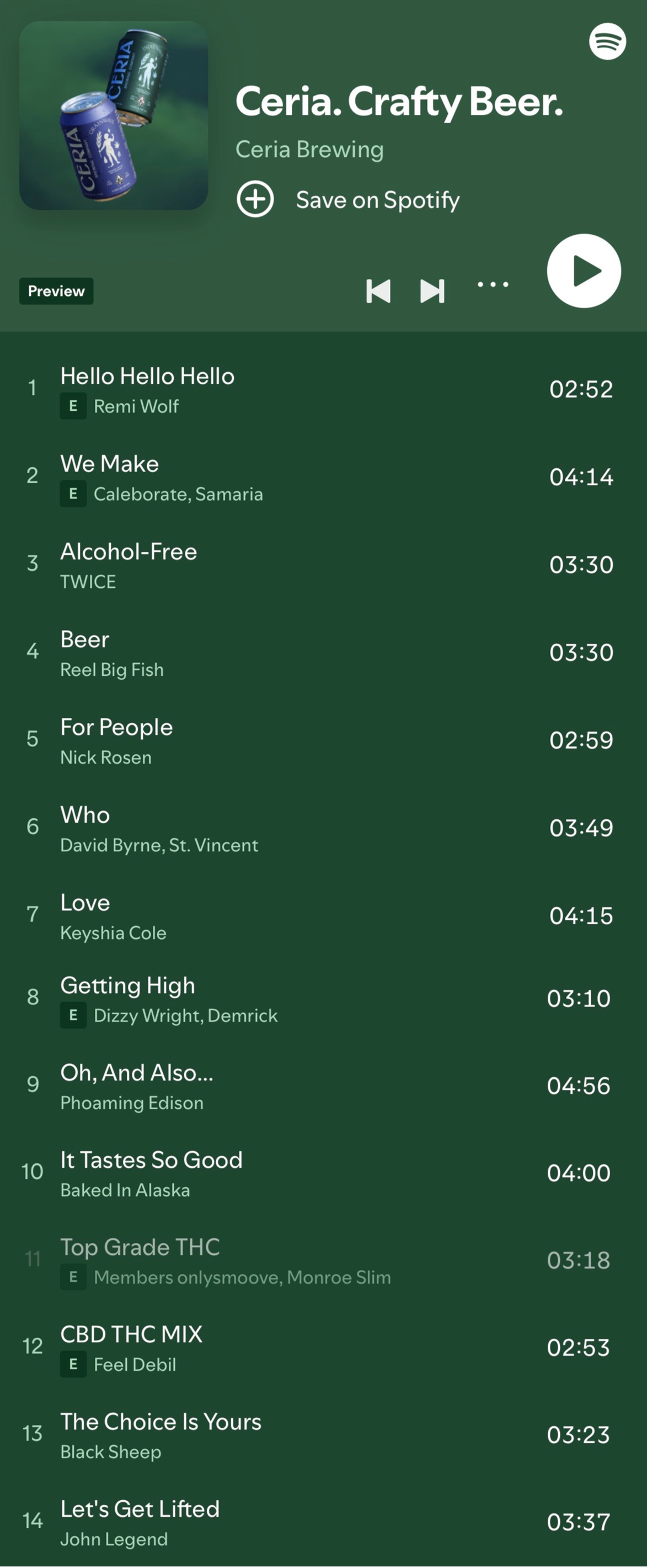 We got around the law by creating a Spotify playlist whose song titles (when read in order) spread the good word about our weed beer.